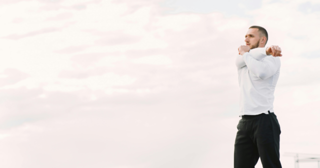 - Step forward with one foot, feeling a gentle stretch in your chest and shoulders.
